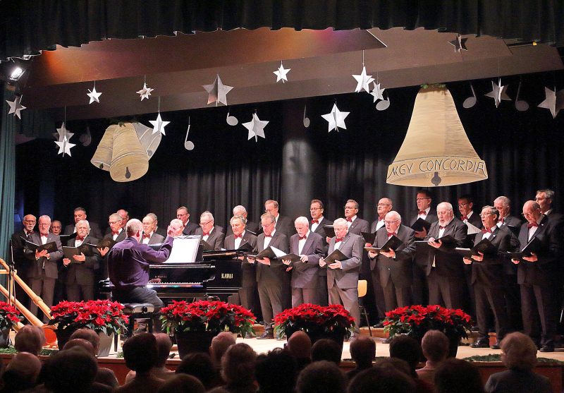 | Der Männergesangverein Concordia Straelen1880 e.V. freute sich bei seinem traditionellen Weihnachtskonzert uner dem Motto „Chorgesang , Magie und Klang" am 3. Adventssonntag 2024 über ein ausverkauftes und festlich geschmücktes Forum Straelen. Unter der Leitung von Antoine Versleijen präsentierten die Sänger der Concordia stimmungsvolle Weihnachtslieder aus aller Welt sowie bekannte Weihnachtsmelodien auch zum Mitsingen. Ein musikalisches Highlight besonderer Art war das Alphorn Ensemble Nieukerk. Drei Alphornbläser unter der Leitung von Hans-Jakob Kaufels spielten neben den obligatorischen Alphorn-Rufen Weihnachtslieder, aber auch Polka und Walzer. Weiter verzaubeten Jemi und Ben die Besucher mit weihnachtlicher Magie und Charlotte Klein trug eine amüsante Weihnachtsgeschichte vor. | |